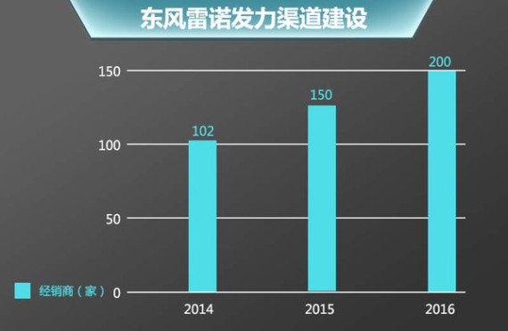在东风与雷诺联姻之前,雷诺在国内已经拥有自己的销售渠道,东风雷诺合资公司的成立,未来雷诺和东风雷诺将整合为一个经销商网络,同时销售进口车和国产型。目前东风雷诺已经建成102家经销商店。其目标是到2015年建成150家,2016年实现建成200家。同时,以推广和销售运动产品为主的雷诺首家性能体验中心,不久前也在上海开业,开创了全新的营销模式。