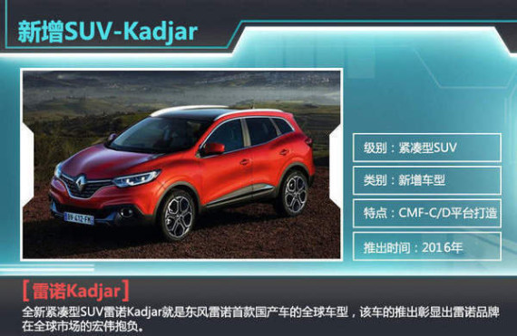 今年2月2日,雷诺一款全新SUV——Kadjar在欧洲进行了全球首次亮相,这款车将成为雷诺在华首款国产车型。该车是基于雷诺-日产联盟CMF-C/D平台打造的一款全新紧凑型SUV。据达业透露,该车将专门针对中国市场加长。届时会有不同排量、不同驱动版本(两驱和四驱)的车型推出。