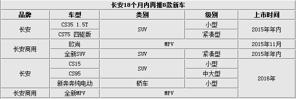 按照李伟的解释,2015年有这一系列新车的推出但在长安内部仍被称作“小年”,2016年将是长安的新车产品的“大年”。据介绍,2016年长安将至少会推出4款全新车型,将涵盖SUV、MPV等增长较快的细分市场,其中包括CS15、CS95两款长安自主乘用车旗下SUV产品,以及长安商用旗下全新MPV产品。此外长安第二款纯电动轿车——新奔奔电动车有望于明年上市。