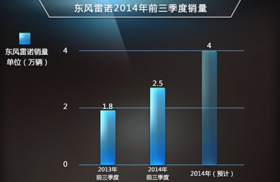 2014年1-9月,东风雷诺共实现销量24,779辆,同比增长36.4%。其中9月份销量达到了3244辆,同比增长223.4%,超额完成此前所制定3000辆的月度销售目标。另外在10月16日雷诺还将在华引入新款风朗,并且加上合资公司的成立,东风雷诺国产车型的推出也在顺利的展开。