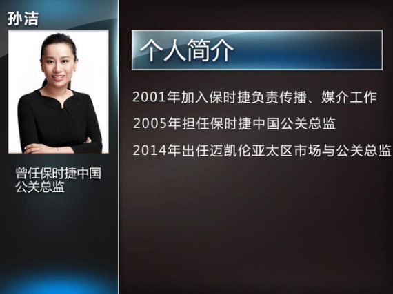之前离职的孙洁女士,在2001年保时捷进入中国初期就已在保时捷中国任职,期间一直负责传播、媒介工作。2005年起,她出任保时捷中国公关总监,在其任内组建、管理了一支高效的公关团队,有效维护并不断提升保时捷在中国市场的品牌形象,同时亦对保时捷在华的整体品牌发展战略和市场营销规划贡献良多,使中国迅速成长为保时捷在全球第二大市场。今年2月孙洁女士正式加盟英国超级跑车迈凯轮中国总部,并出任亚太区市场与公关总监一职。