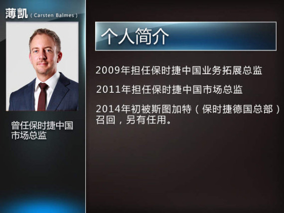 当时与孙洁女士同时离职还有薄凯(Carsten Balmes)先生,他于2009年加入保时捷中国担任业务拓展总监一职。当时保时捷在华仅有20家经销商,仅用3年时间薄凯就将经销商数量翻倍扩展至36家。凭借这一杰出成绩2011年薄凯升任为保时捷中国市场总监。在2014年初的时候被斯图加特(保时捷德国总部)召回,另有任用。