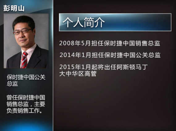 近日刚刚离职的彭明山于2008年5月起担任保时捷中国销售总监一职,在任职期内的六年时间里,保时捷中国的销售量实现了突飞猛进的增长,为中国成为保时捷全球第二大市场及保时捷跑车全球销量最大的市场之一做出了很大的贡献。彭明山从2014年1月起负责保时捷中国公关总监一职,对于彭明山的上任,保时捷中国首席执行总裁潘德旭给予了充分的肯定,并表示:“拥有丰富的在中国及国际市场的业务开拓经验及优秀的领导和管理才华。”但在该职位上仅仅任职一年,彭明山即将于明年1月离开保时捷中国,任职阿斯顿大中华区高管。