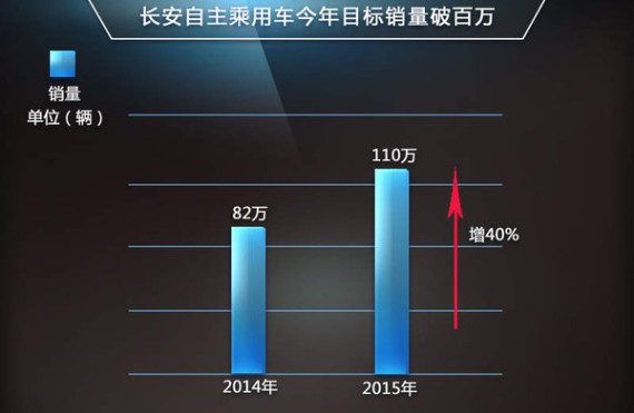 又到年初,各大厂商上一年的全年销量纷纷出炉。数据显示,长安自主品牌乘用车在行业连续15个月下滑的背景下,全年累计销售汽车82万辆,同比2013年增长49%。长安汽车股份有限公司副总裁龚兵近日在接受媒体采访时表示:2015年长安汽车有信心增长速度保持在40%左右。这意味着,今年长安汽车目标销量要突破100万辆。同时网通社从长安汽车内部人士处了解到,今年长安乘用车将推出多款全新车型以及年款车型,其中率先上市的将是逸动电动版。