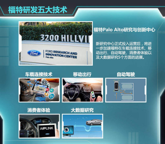 在福特汽车发展规划中,创新型智能技术将是重要一环,全新研究中心投入运营后将加速福特研发创新技术并进行普及。“福特不仅仅是一家汽车制造商,也是一个智能移动技术研发公司,我们力求将创新带入业务的方方面面,”福特汽车公司总裁兼首席执行官马克•菲尔兹先生说。“这个新研究中心的落成表明,福特始终致力于成为硅谷创新生态系统中的一份子,在车载连接技术、移动出行和自动驾驶方面满足消费者的愿望和需求。我们的目标是让这些新技术惠及所有人,而不仅仅是奢侈品消费者。”