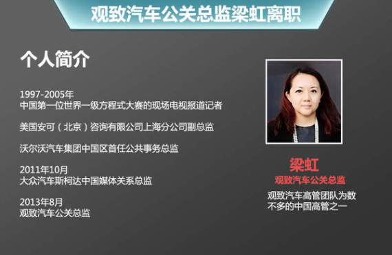 对于梁虹女士的离开,该内部人士表示:“公司高层对梁虹率领的公关团队表示肯定,并祝福她在今后的事业中有更好的发展。”不久之后,观致汽车也将正式公布新任公关总监的人选。