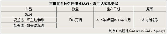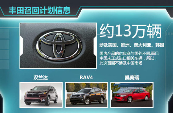根据丰田公布的消息,此次召回计划涉及车型为汉兰达、汉兰达混动版、凯美瑞、凯美瑞混动版和RAV4。涉及车辆生产日期范围是2014年8月至2014年12月。召回计划,将在北美、欧洲、澳大利亚、韩国实施,共计约13万辆车受到影响。