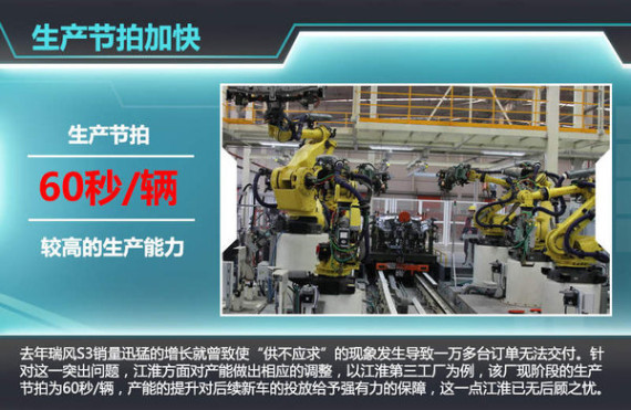 新车投放脚步的加快以及销量的快速增长,对企业不仅带来丰厚的利润,与之而来的还有产能不足的问题。去年瑞风S3销量迅猛的增长就曾致使“供不应求”的现象发生,导致一万多台订单无法交付,造成客户的流失。针对这一突出问题,江淮方面对产能做出相应的调整,目前已经维持在一个较高的生产能力。以生产瑞风S3的江淮第三工厂为例,该厂现阶段的生产节拍为60秒/辆,产能的提升对后续新车的投放给予强有力的保障,这一点江淮已无后顾之忧。