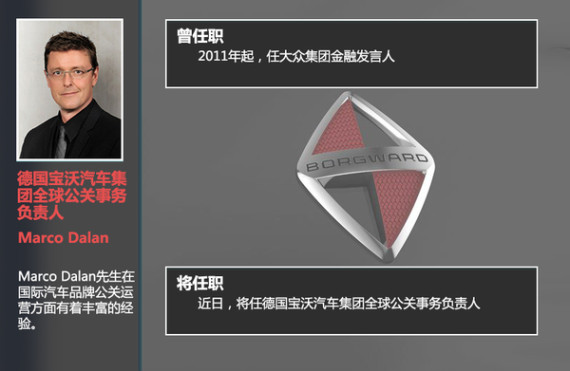 现年48岁的Marco Dalan先生在担任大众集团金融发言人的过去四年里,同时负责大众汽车集团MAN、斯堪尼亚和大众商用车公关传播工作,在国际汽车品牌公关运营方面积累了丰富的经验。在此之前,Marco Dalan先生还曾在欧洲最具影响力之一的媒体《世界报》(DIE WELT)出任资深财经编辑,拥有超过十年的丰富经验,在商业领域具有很大的影响力。其广泛而深厚的媒体及公关传播工作背景将非常有助于德国宝沃汽车全球公关业务,尤其是在中国市场公关业务的推进。
