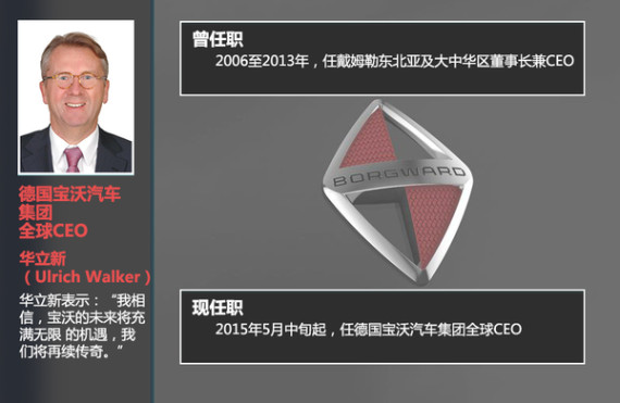 两位业内精英分别为前戴姆勒东北亚及大中华区董事长兼首席执行官华立新(Ulrich Walker)现任德国宝沃汽车集团CEO;前大众集团金融发言人Marco Dalan将任德国宝沃汽车集团全球公关事务负责人。两位高管对国际化汽车品牌的运营、管理和对跨国业务的拓展都有着丰富的经验。宝沃汽车集团与北汽福田股份有限公司的深入合作将帮助宝沃全面布局车型的在华投产。