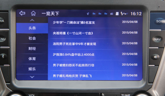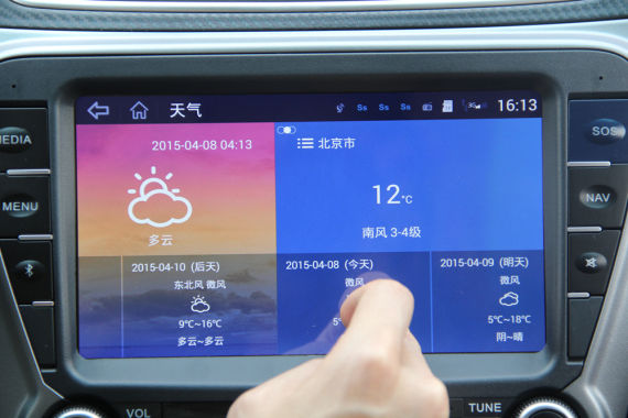 在线天气,可以任意添加城市,通过滑动就可以切换了,这个天气界面也是目前各车载系统里比较美观的了,并且滑动速度虽然比不上ipad,但是达到中等以上的平板水平还是没什么问题的。