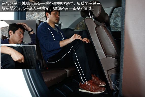 大家最为关注的第三排座椅空间,在编辑看来还是非常出色的,经过加长后的轴距直接提升了第二排与第三排的纵向乘坐空间。当然受制于车顶后方下倾的线条,乘坐第三排时,头部空间表现不佳。不过模特表示,可以通过腿部前移、后背向下靠的方法,还是可以换回一定的头部空间,而此时腿部空间依然比较充裕。