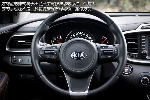 不得不说,镀铬金属亮条包边的内饰配合黑棕双色内饰的搭配,有一种自然的豪华感,圆润的曲线配合对称式的中控台设计,让许多完美主义的人挑不出毛病。唯一的遗憾,还是那个经久不变的三幅式的方向盘,有些破坏了整体的美感。不过总的来说,索兰托L的内饰家族气息浓重,视觉感受还算不错。
