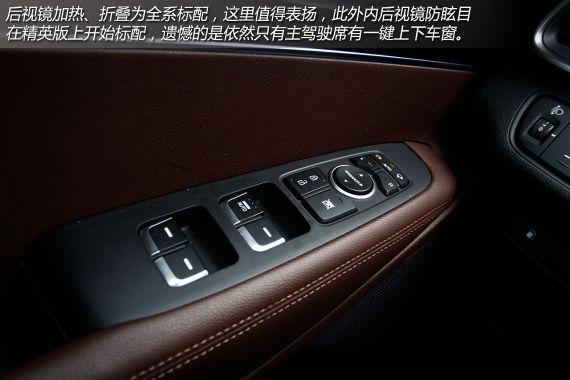 当然,高配车型还拥有精英版仰视的前排座椅通风功能和第二排座椅加热功能,座椅记忆、副驾驶座椅电动调节也都在尊贵版上可以找到,本车型并没有配备,故此不在赘述。