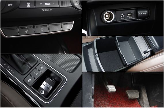 诸如方向盘加热、前排座椅加热、倒车影像这些舒适实用的配置在索兰托L精英版上都有配备,当然驾驶模式选择以及低速锁止四驱按钮也都一应俱全就,前排还配有AUX以及可充电式USB接口和12V电源插口。遗憾的是宽大的双层中央扶手箱顶盖靠垫并不能滑动,而陡坡缓降系统也一并缺席全系车型。