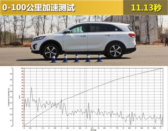 由于在全力起步时,索兰托L依然是偏重前轮驱动,虽然加速的一瞬间四条轮胎并没有打滑,但车头的姿态还是略微扬起。而在加速过程中,G值一直没有超过0.5,说明这款2.4L引擎的爆发力还有所欠缺。在一挡换二挡时,变速箱的反应还是稍微偏慢,中间浪费了0.5s。整体来看,一气呵成的加速过程虽平淡却也是较为平顺。