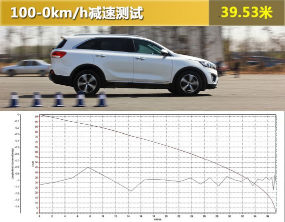 从刹车曲线来看,索兰托L整体制动较为柔和,尤其是在初段,刹车偏软。而在制动中后段,刹车系统才开始全力工作,制动力也有了显著的提升。最终获得的40m不到的最佳制动成绩还是值得表扬,毕竟这么大的身躯,还能有多次紧急制动表现依然稳定的成绩,实属不易。