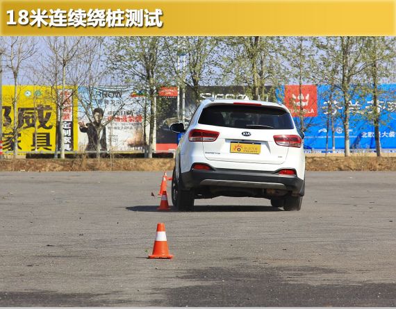 在18m绕桩测试中,索兰托L还是出现了SUV典型的明显侧倾,尤其是在方向刚刚偏移时,车内的摇晃十分明显。但当悬挂压缩到一定行程时,悬挂系统还是可以抑制一定的侧倾,保证车辆顺利通过弯心。当然,这种重心较高的中大型SUV,对于这样的测试,只要转向灵活、尾部有一定的循迹性就算是合格。