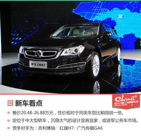 每届车展北汽绅宝的展台总会有几款新面孔与大家见面,绅宝D80便是在去年广州车展上亮相的全新车型,而在本次2015上海车展上,绅宝D80以20.48-26.88万的售价正式上市。随着不久前吉利汽车全新中型轿车博瑞的上市,不难看出自主品牌已逐渐开始发力中大型轿车市场,此次绅宝D80的上市也填补了北汽绅宝在该级别中车型的空白。借着上海车展,新浪汽车也为您带来了关于这款绅宝D80的静态评测。