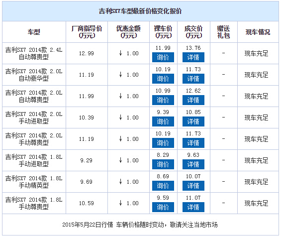 新浪银川汽车讯 近日,编辑从吉利汽车银川茂泉4S店了解到,吉利SX7现车销售,颜色可选,目前购车部分车型可优惠1.00万元,感兴趣的朋友可以到店咨询购买。
