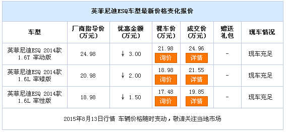 新浪银川汽车讯 近日,编辑从英菲尼迪宁夏润德4S店了解到,英菲尼迪ESQ现车销售,颜色可选,部分车型购车优惠3万元,感兴趣的朋友可到店咨询购买。