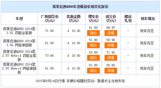 新浪银川汽车讯 近日,编辑从宁夏润德英菲尼迪4S店了解到,英菲尼迪QX60现车销售,颜色可选,目前购车部分车型可优惠10.00万元,感兴趣的朋友可以到店咨询购买。