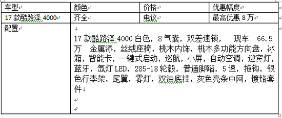 近日,天津保税区车源峰汽车贸易有限公司新到一批17款丰田酷路泽4000中东版,价格可优惠,多款配置颜色可选。本店内车辆关单、商检手续齐全 ,当日可提车,承接汽车装饰,全国购车皆可办理分期付款。配置见下表: