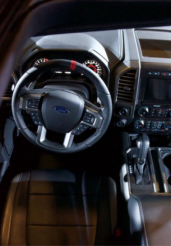 内饰方面:17款福特猛禽F150内饰也是一派硬汉形象。座椅在6个方向上都有液压支撑,即使在剧烈颠簸的路面上,也能安然稳坐。方向盘看起来非常豪华,四辐式握起来非常舒服。福特F150驾驶舱空间宽广,橙色与黑色的搭配,非常醒目。福特猛禽F150正副驾驶席中间布置了一个巨大的手枕。