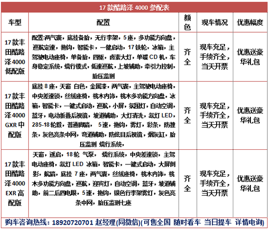 从天津愿景浩祥汽车销售有限公司获悉,店内2017款丰田酷路泽4000中东超值优惠限时秒杀,店内现车特价,贷款购车享受超低首付,网站客户购车可享折上折优惠价,热销全国享受批发价,当日提车开票,拒绝虚假报价,诚信为先,全国购车皆可办理分期付款。购车咨询热线:18920720701赵经理(同微信)(可售全国 随时看车 当日提车 详情电询)