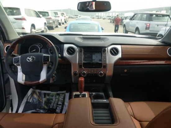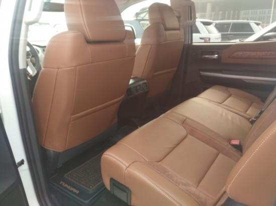 17款丰田坦途1794版美版20寸轮毂,轮胎与车身中间的距离之大,如同有底盘升降的越野车型,很适合越野。丰田坦途这款车是一款男人味十足的车。试想一下,你如果站在这款车身旁,映衬着后面高大的车身,大气粗犷的线条,将会是怎样一种景象。采用了用于雷克萨斯顶级SUVLX570相同的5.7L V8发动机,拥有401Nm的最大扭矩,动力极为滂湃。