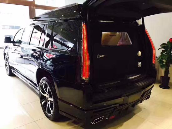 17款凯迪拉克凯雷德总统一号,加长5.9米,黑色,内饰咖/米双色,6.2L V8 发动机,8速变速箱,4轮驱动,自动调节悬挂系统,电子转向系统,拖车系统,前舱bose环绕立体声音响,主动噪音消除,收音机、CD、MP3,高清卫星收音机,卡迪拉克CUE系统及8寸导航屏幕,蓝牙系统,12英寸可构建显示及驾驶员信息中心,抬头显示,皮质方向盘,加热方向盘,方向盘带控制中心,按键启动,遥控启动,无钥匙方便进入,12方向皮座椅,加热、通风前座椅,第二排座椅加热、电动可翻倒,四门电动窗、前排可一键上下,前后独立控制舒适空调系统,电动可折叠带加热及转向灯的反光镜,雨量感应雨刷,自动远光前灯,前后停车辅助,电动掀起和划动天窗,22寸铝合金轮毂,电动可调整开启角度尾门,双级开启气囊,头胸部气囊,自动稳定带循迹系统,胎压监控,环影系统,防盗系统,盲点警示,后车流警示,驾驶员警示包。后舱6向高级德国Napa真皮航空座椅带加热及气动按摩,舒适腿托,4区域高级气氛灯,可独立控制,梦幻满天星,V型海燕日光模拟灯光效果,梦幻蓝夜间气氛灯