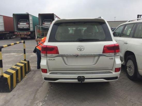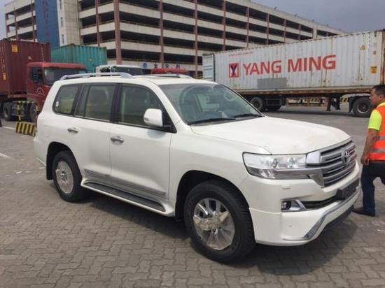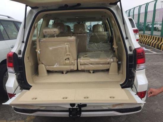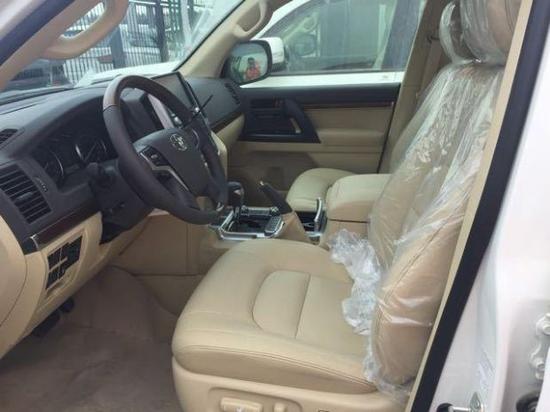 17款丰田酷路泽4000中东版顶配此车实拍图配置详解:18合金轮、天窗、底挂、8气囊、8座真皮、智能卡、遥启、主副驾多向电动座椅调理、多功效大屏带导航、皮木多功效偏向盘、桃木内饰、主动空调、主动变光后视镜、冰箱、氙灯带LED灯、LED室内灯、坡起帮助、蠕动模式、胎压监测、定速巡航、前后雾灯、倒影、行李架、航踏、后雷达、拖钩、电动折镜(后歪斜功效)、大灯洗濯、先后包围、镀铬门把、车身镀铬防刮饰条、地毯。