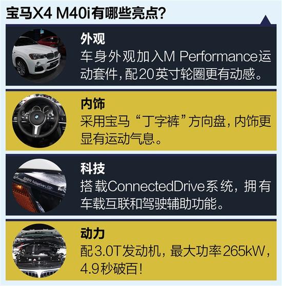 2016北美车展上,宝马带来了一款高性能X4车型——X4 M40i,这款车型搭载3.0T涡轮增压发动机,0-100km/h加速时间仅需4.9s,竞争对手直指奥迪SQ5 (配置|询价)。其实它在国内的申报工作已经在进行,很快就能进入国内,不过在我们还没有看到它真面目之前,先趁着北美车展这个大好机会,仔细品味一下这款车,看看它有哪些值得我们期待的地方。购车咨询热线在文章下方,详情来电咨询!(电话同微信)