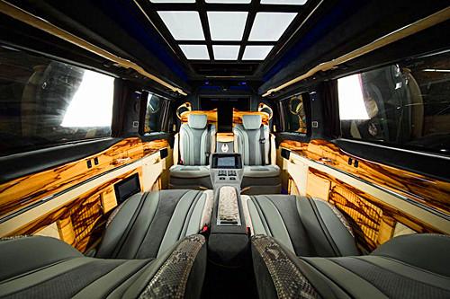 前吧台座椅中心镶嵌了英国进口钟表,表盘周围镶嵌588颗锆(gao)石,散发出来的光芒引人注目,极具奢华感。艳丽的红宝石点缀蛇眼,衬托整体造型的灵动感。黑玛瑙与红宝石相映成趣,色彩对比非常醒目,装饰定制珠宝的杯托和时钟,都成为定制款精湛技艺和艺术造诣的完美呈现。可以说是国内前所未有的超级豪华商务车型。