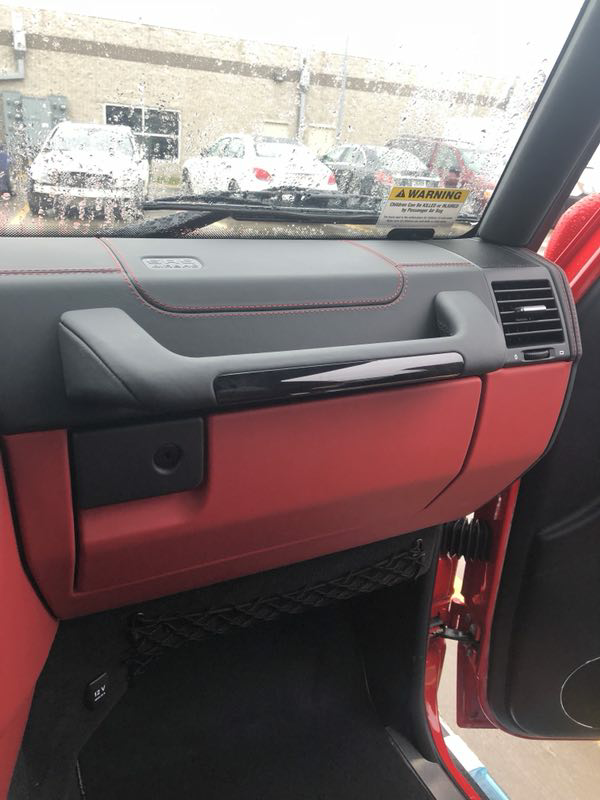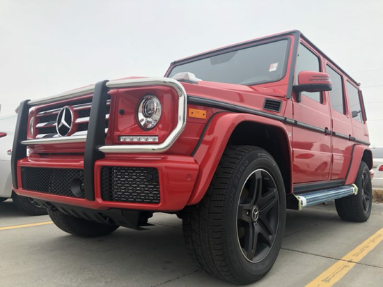 2018款奔驰G550选配:designo红色岩浆金属漆,designo高级纳帕真皮座椅,无烟煤内饰,可调自适应悬挂,黑色外部防护条,designo双色调内饰,双色多功能方向盘,红色安全带,AMG熏黑轮毂