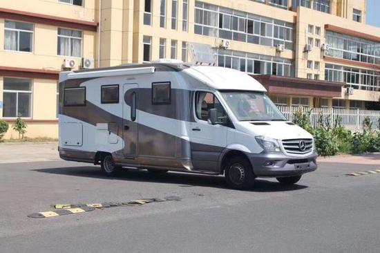 新星奔驰外观采用小顶额头造型,降低风阻,有效的达到了节省能耗的效果。车身尺寸为7490*2280*3020mm,轴距达4325mm,整车荷载4-6人,车外配有4m长电动伸缩遮阳蓬、户外灯、感应式电动踏步、外接水电口等基本配置。