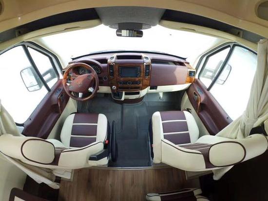 车内采用红木色配饰家具高端大气,会客区配备航空座椅,可电动调节靠背角度、腿托及按摩功能,其中一个单人座椅还能够270度旋转,乘客区的桌子可升降、旋转、滑移。498529215544303608.jpg
