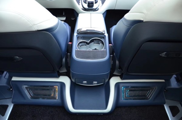 非凡的内饰展现在每一个细节,无隔断式设计让内部空间感更加宽阔。中央的首长席座椅多功多样,包括有多向电动调节、腿托、前后旋转等。车顶采用简洁化的设计,采用Alcantara包裹高档感十足。两张座椅皮质与填充物方面都以舒适为主。上面的缝线也相当细腻,首长席折叠电脑桌闪耀。