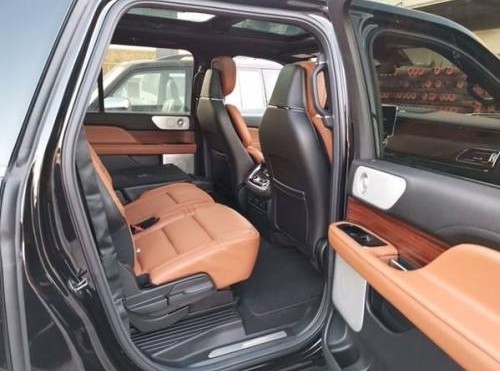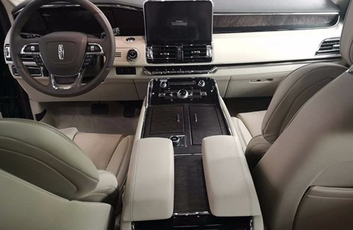 19款林肯领航员的内饰非常奢华,多功能方向盘,中控台的造型与宽大的车身相呼应,新车全部真皮包裹座椅,内饰采用桃木搭配设计,高贵典雅,加高加大的车身除了增加内部空间外,还给人营造一种尊贵典雅的感觉。最新林肯领航员新车采用了2+2+3的座椅布局,第二排采用了两个独立座椅,座椅内侧均配有扶手,舒适度超强,可以随意折叠调配,二三排折叠,立刻变身货车,车内空间扩升至2926升。领航员的第三排空间比很多7座MPV还要好。身高1.85米的体验者坐到第三排,无论头部还是腿部都有富余的空间。
