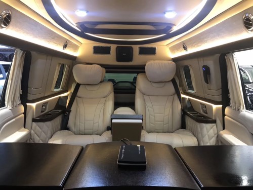 2019款林肯领袖一号商务车的内饰是纯手工打造,内饰布局上前后舱隔开设计,隔断上配置升降电视,座椅则是对坐设计,再通过各种巧妙的设计,让各种电子设备融入车内。