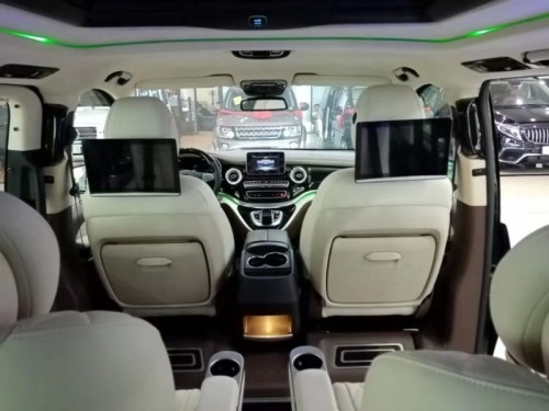 配置:19款中东版V250,66.5W,配置:陆耐,航空座椅,沙发床,主副座椅包覆真皮,主副门板包覆,中门门板包覆,B柱+车厢两侧内饰板包覆,尾门包覆,鹿皮顶(行云流水),半桃木方向盘,仪表台下部包覆,拉手、内饰件喷漆,全车桃木,侧墙、中门氛围灯+亮条,迈巴赫顶灯,迈巴赫钟表,高光印花地板+水晶垫,扶手箱带冰箱,中排连体踏板;定制迎宾踏板,(迈巴赫款+水晶垫)行李架,LED大灯,倒影,镀铬出风口,全车隔音,18寸迈巴赫轮毂,小包围+日行灯,头枕娱乐屏,后靠背原装桌板,中网喷漆,窗帘,奔驰镜面标,锁止按钮,