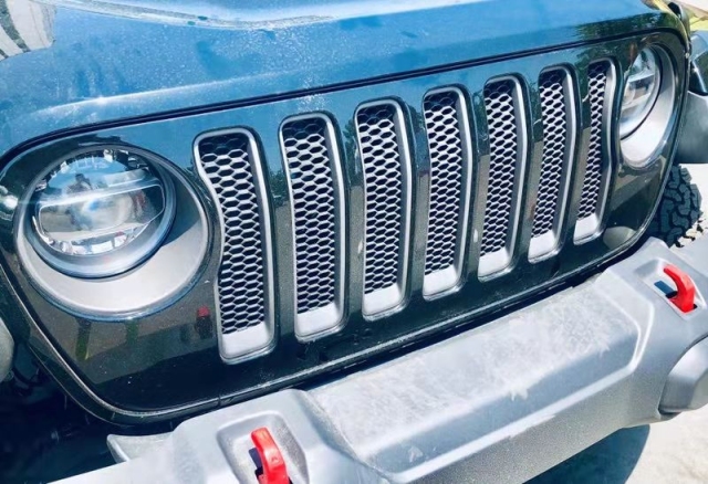大部分光源都采用LED显得高级感十足,原本的圆形大灯下方两侧的小圆灯也变成方形,而且距离中网更远一些,显得不会那么拥挤。中网依旧是保持竖直型格栅具备辨识度,车头侧面则是暗红的“RUBICON”标识。