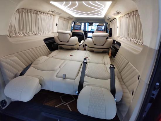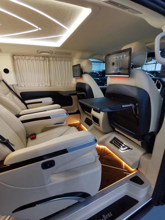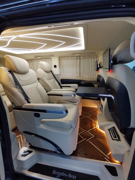 奔驰威霆改装商务车 商务接待内饰太奢华了,首先,在座椅部分,宽大厚软的真皮座椅,具备多向调节与按摩等功能更佳;毕竟MPV不是小巴士,不必追求座位数量;MPV改装应追求乘坐体验,为达到此目的,换上一套大沙发也未尝不可。得益于MPV巨大的内部空间,改装内饰时自由度更高;玩家们可以毫无压力地在MPV的车厢里打造一个豪华包厢,让乘客在行驶过程中获得豪华体验。