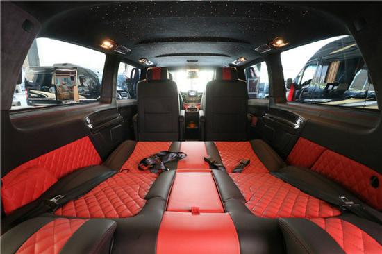 车顶采用简洁化的设计,采用Alcantara包裹高档感十足。两张座椅皮质与填充物方面都以舒适为主。上面的缝线也相当细腻。巴博斯V250最后排有一项神秘又实用的配置。那就是后排除了正常容纳三名乘客非常宽松的乘坐之外,还能将其完全放平,形成一张可供临时休息的旅行床。