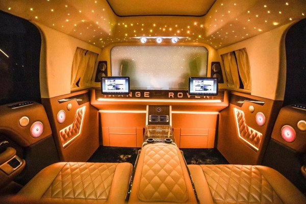 19款路虎高顶皇家一号配备SONY高清LED电视、SONY蓝光DVD、以色列卫星天线、BOSE5.1殿堂级影院系统、多功能加热按摩座椅、车载小冰箱、空气净化器、电动伸缩前座椅、触摸屏控制系统、后排腿托、辅助空调、氛围灯、前后对讲、前后摄像头、鞋托/传真、豪华游艇木、升降大屏幕液晶显示系统、无线上网功能(配备:ipodmini控制全车电子系统) 路虎揽胜皇家一号的车内配有简洁但做工却非常考究的吧台,让您置身车内尽可享受舒适奢华的贵宾式待遇。