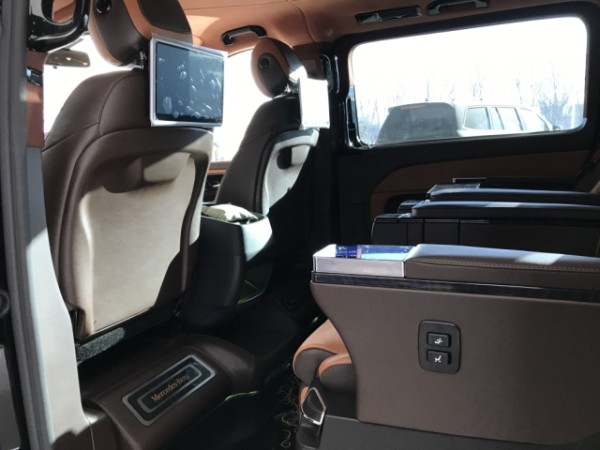 19款奔驰V250正副驾座的后背上,不只是配备了折叠小桌板,更是添加了两个独立Ipad,享受这片区域能够带给贵宾们最佳的娱乐放松。无隔断升级的内饰达到前所未有的豪华与精致,重新定义成功与财富的内涵。以黑色为主色调的内饰风格,体现商务的冷静和稳重气质,大尺寸显示屏真是让人钟爱的设计。后电动窗帘系统,搭配浅色的窗帘和其他内饰装饰,灯光照明,氛围灯饰环绕,乘客乘坐的大环境更为自然舒适。)