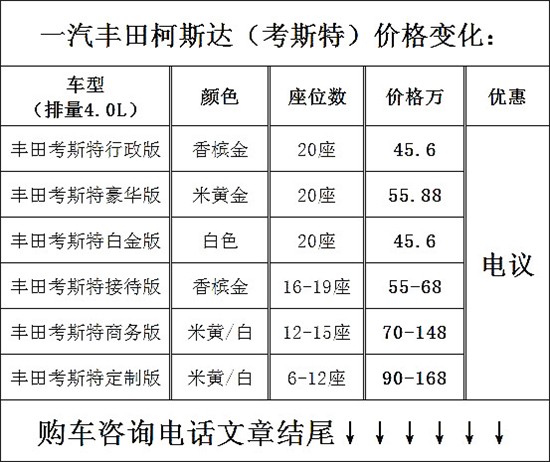 丰田专卖店新款柯斯达 (配置|询价)、考斯特、9座、10座、11座、12座、13座、15座、16座、17座、19座、20座、23座现车销售, 豪华内饰改装。丰田考斯特11座至尊版、柯斯达12座(奢华版、旗舰版、VIP版)13座(VIP版、超VIP尊贵版、至尊旗舰版)16座(超VIP版、超VIP商务版)17座(VIP版、超VIP商务版)颜色米黄金属色、合格证与座位相符!