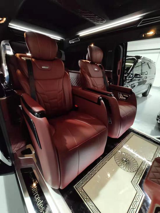2019款奔驰V260L改装商务车第二排航空座椅为带电动、加热、按摩、通风功能的航空级首长席,可沿着地面上滑轨实现一键电动式前后滑动,对于这种智能化的乘坐体验,是原厂车型笨拙的手动拖拽模式所望尘莫及的。