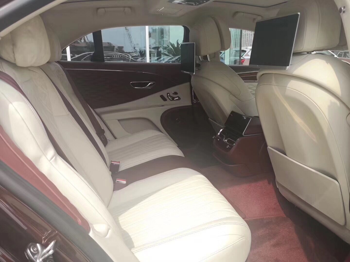 头枕后方的显示屏为后排乘客提供影音娱乐系统,两侧各有一个大屏,可分别看自己喜欢的电影等,后排的设备接口都设计在座椅靠背的后面,USB接口,高清视频接口,SD记忆卡槽,DVD碟舱,非常丰富。