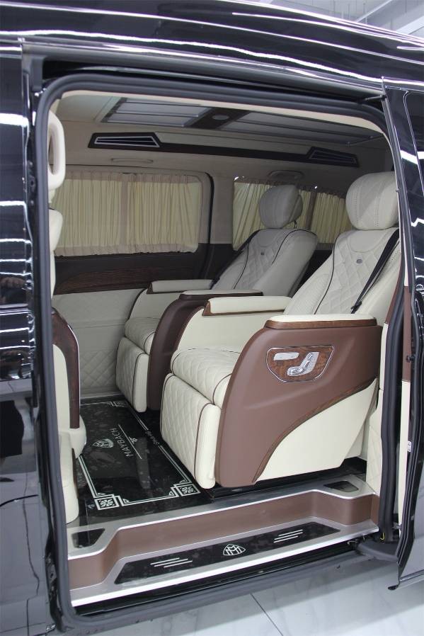 2019款奔驰麦特斯,迈巴赫版 配置:进口伟巴斯特天窗; 行云流水内饰顶棚包覆; Vclass大灯,日间行灯; 双侧电动门; 集成转向灯后视镜; 行李架、整车镀铬装饰; 迈巴赫不锈钢脚踏; 迈巴赫中网; 打孔真皮方向盘; 银色出风口; 真皮中控台; V-class (配置|询价) 流水式中央扶手箱; 打孔真皮座椅; 高级烤漆装饰; 12.3英寸多功能导航一体机; 倒车影像; 车载12L温控冰箱; 灯光触控系统;车载辅助充电;折叠小桌板; 二排打孔真皮S级 (配置|询价)航空座椅带有加热、通风、按摩、180度旋转功能; 三排打孔真皮折叠座椅,180度电动沙发床; 行政会议桌,双头枕DVD; 六宫格顶灯(或盾型灯);黑色迈巴赫印花地板;
